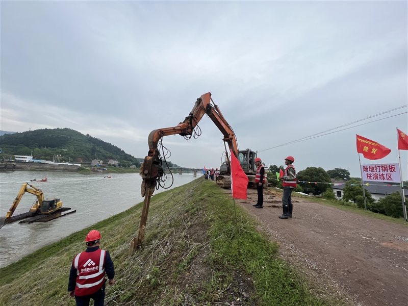 5月11日上午,根據(jù)市、區(qū)防指的統(tǒng)一部署,宣城市暨宣州區(qū)2023年防汛搶險(xiǎn)實(shí)戰(zhàn)演練活動(dòng)在朱橋鄉(xiāng)北山港口舉行,共27支抗洪搶險(xiǎn)隊(duì)參與演練活動(dòng)。演練內(nèi)容包括打樁、加子埂、反濾圍井、開溝導(dǎo)滲、水下?lián)岆U(xiǎn)、水上編隊(duì)航行和人員搜救轉(zhuǎn)移演練。安徽鰲峰建設(shè)集團(tuán)有限公司搶險(xiǎn)隊(duì)共10人參加陸地鋼板樁演練。